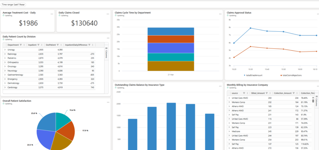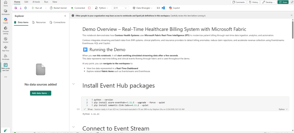 One great example of what JumpStart can do is a real-time healthcare use case. Using a pre-built notebook, you can simulate streaming patient or billing data flowing through Microsoft Fabric’s Real-Time Intelligence stack — think Eventstream ingesting live data, an Eventhouse storing it for ultra-low-latency queries, and a live KQL dashboard updating in real time right before your eyes.