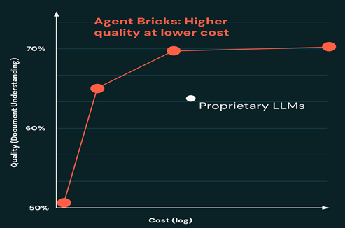 - For document understanding tasks, Agent Bricks delivers higher-quality results at significantly lower cost compared to prompt-optimized proprietary LLMs. In fact, it can outperform these models on document parsing benchmarks while reducing costs by up to 10×.https://docs.databricks.com/generative-ai/ai-builder
